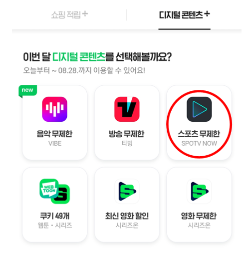 2. 디지털 콘텐츠 혜택으로 [스포츠 무제한] 선택해주세요.