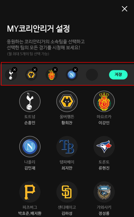 ※ MY코리안리거는 한국인 선수가 '소속된 팀'을 월 최대 5개까지 선택 가능하며, 선택한 팀의 모든 경기를 시청할 수 있습니다.