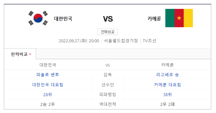 이 포스팅에서는 2022년 09월 27일 대한민국 카메룬 한국 축구 국가대표 선수 명단 선발 라인업 평가전 중계 해설 실시간 보러 가기 방법 함께 알아보도록 하겠습니다.