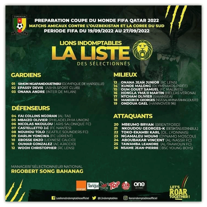 장 오나나(랑스) 마르탱 옹글라(헬라스 베로나) 사무엘 그웻(KV 메헬렌) 가엘 옹두아(하노버) 조르주 만젝(네아 살라미스) 올리비에 은참(스완지시티) 피에르 쿤데(올림피아코스)